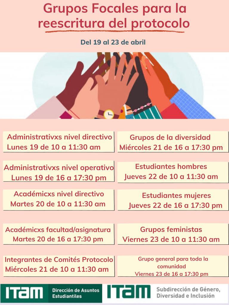Te invitamos a participar en la siguiente etapa de la reescritura del protocolo para la atención de la violencia de género, mediante grupos focales dirigidos al personal administrativo, profesorado y estudiantes, que se llevarán a cabo del 19 al 23 de abril de 2021.