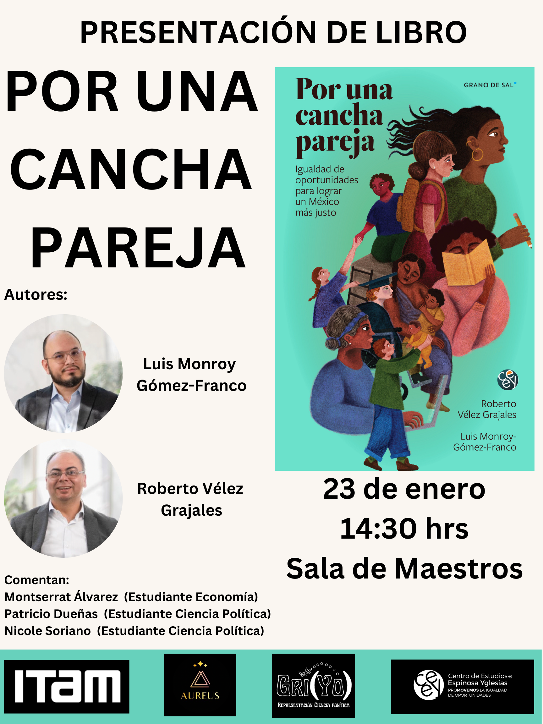 Te invitamos a la presentación del libro "Por una cancha pareja" de los autores Luis Monroy y Roberto Vélez donde a través del diálogo con alumnos de Economía y Ciencia Política se buscará abordar la falta de condiciones para combatir los problemas que vienen con la desigualdad y así proponer una verdadera oportunidad de oportunidad entendido a través de proveer servicios públicos de manera equitativa, favorecer la movilidad social y destacar el esfuerzo de los individuos.